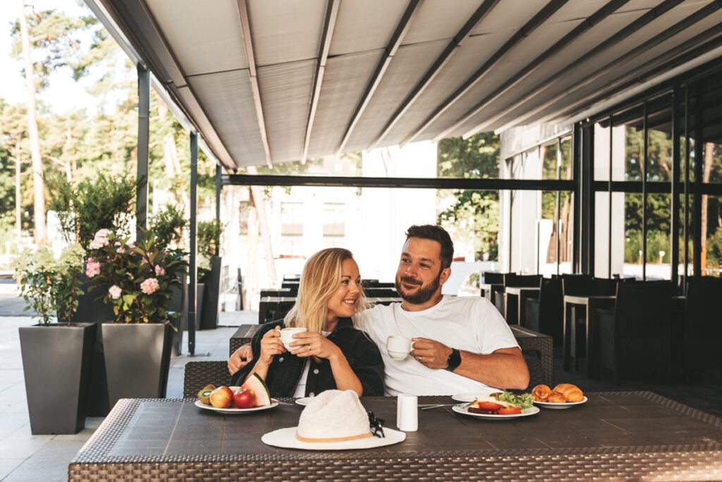 The program includes a delicious breakfast (7:30–10:00), a relaxing back massage (30 min), a warming ozokerite and paraffin application for one zone (15 min), and a revitalizing oxygen cocktail. This service is available on weekdays only. Guests also receive a 10% discount on the restaurant “Jūrmala” à la carte menu.